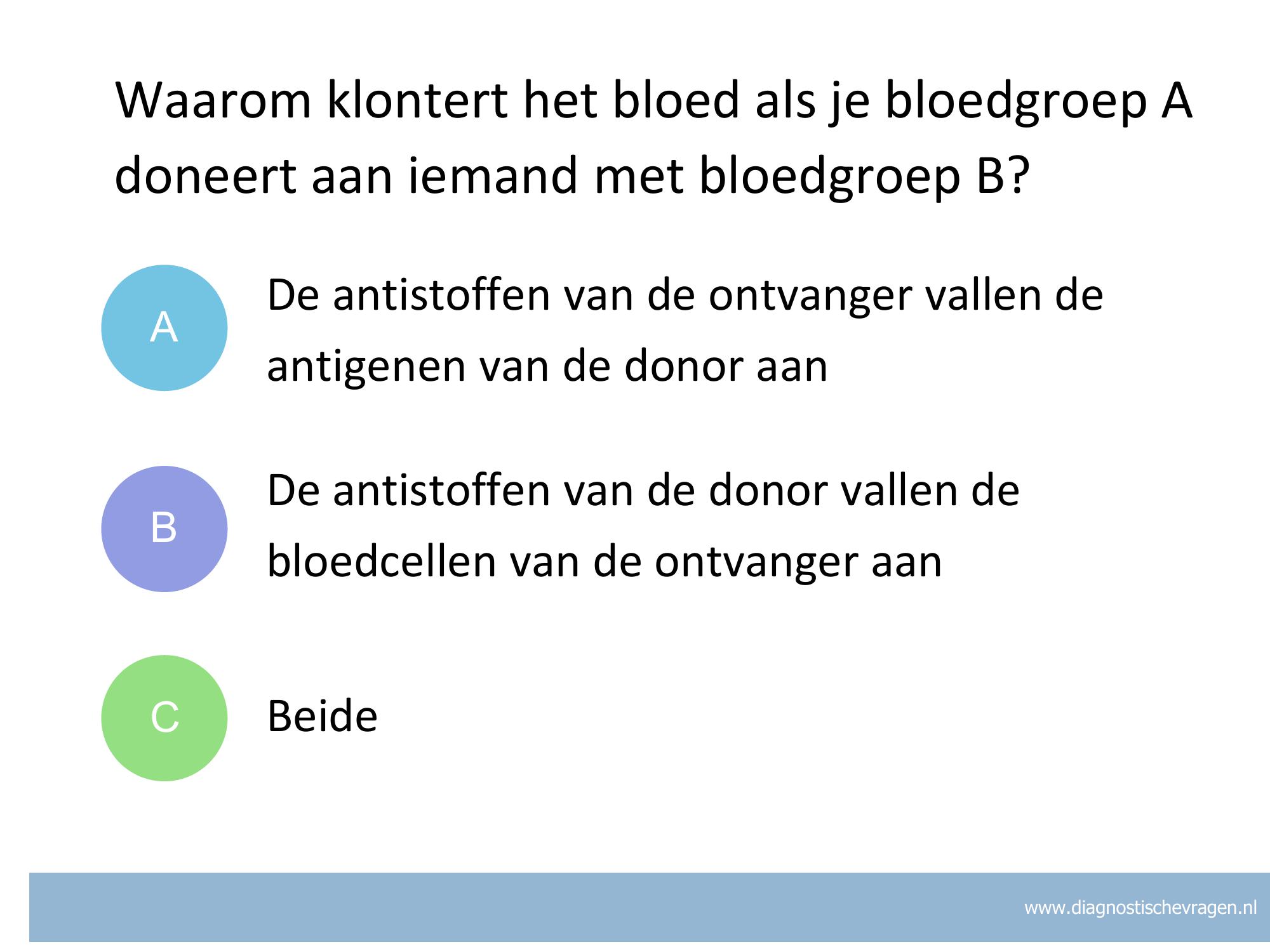 B De leerlingen denken dat het plasma van de ontvanger ook gedoneerd wordt en dus anti-B van de donor in het bloed van de ontvanger komt. Ze vergeten dat de ontvanger anti-A heeft in het plasma.