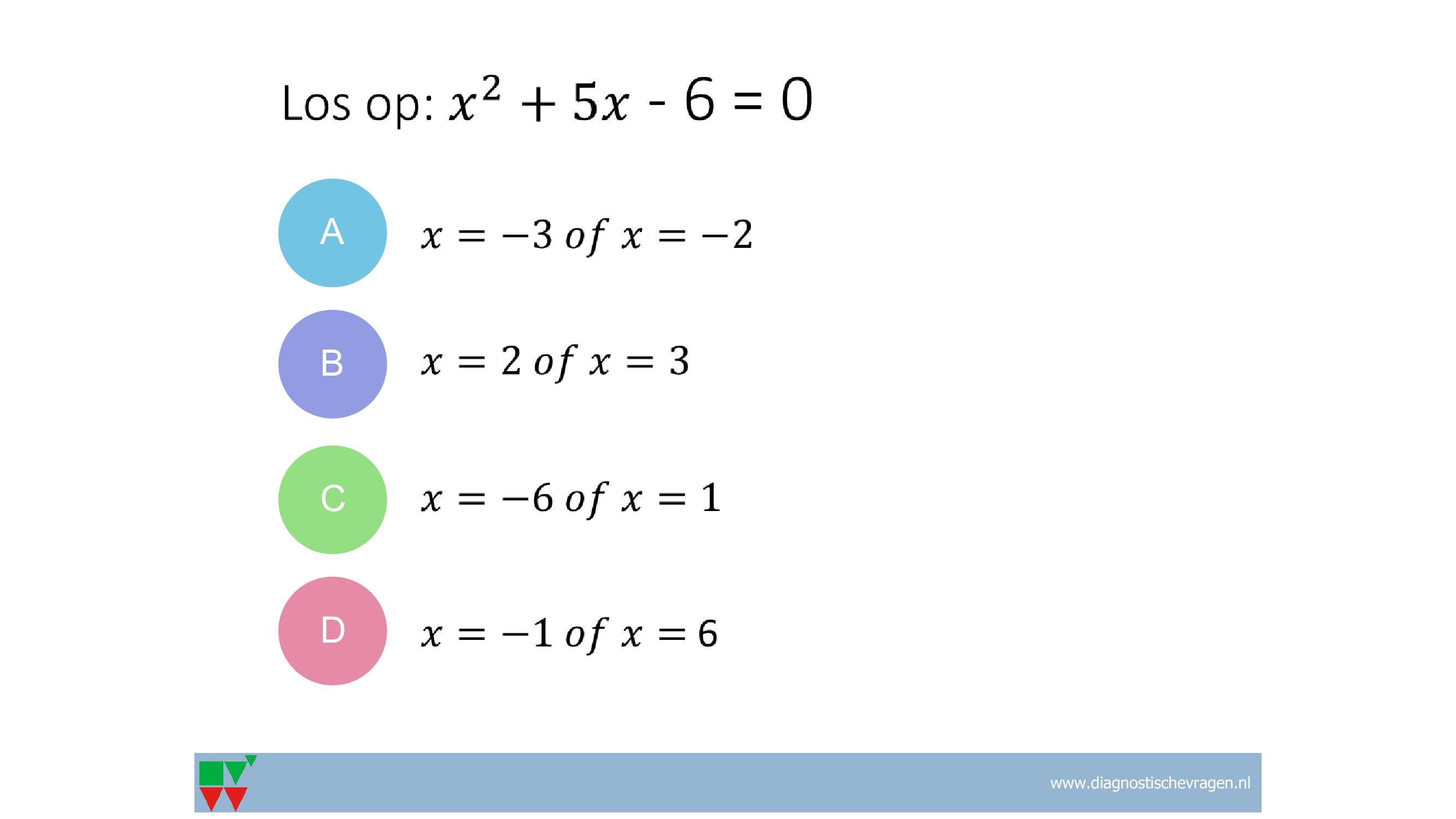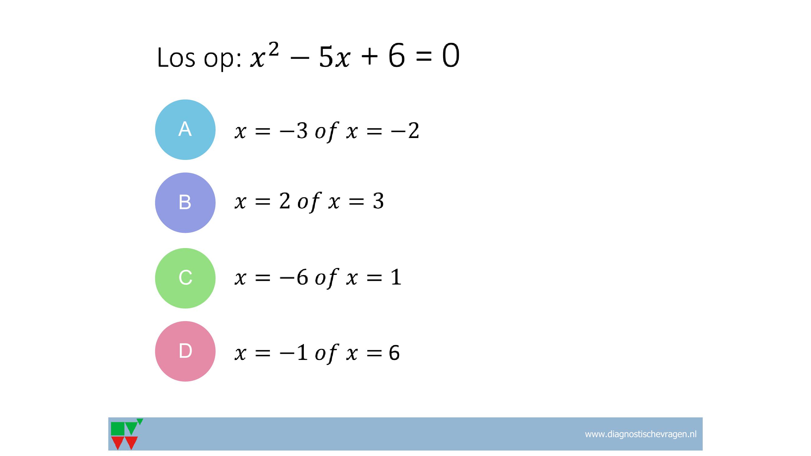 B: verkeerde ontbinding: (x-2)(x-3), dan misvatting dat twee negatieve getallen samen positief worden na optelling